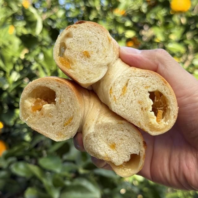 柚子生地に甘酸っぱい柚子ピールとクーベルチュールホワイトチョコレートを巻き込みました。
